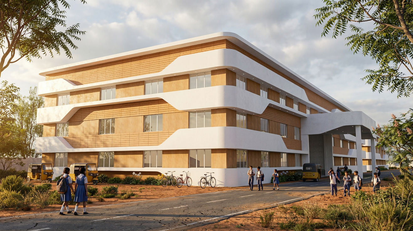Design Description: Set against a backdrop of rich terracotta soil and native scrubland, this school campus is designed as a vibrant educational oasis. The main academic block is defined by its striking facade, where undulating, ribbon-like white bands wrap around warm, wood-toned cladding. These horizontal elements not only provide visual dynamism but also serve as crucial shading devices against the harsh sun.